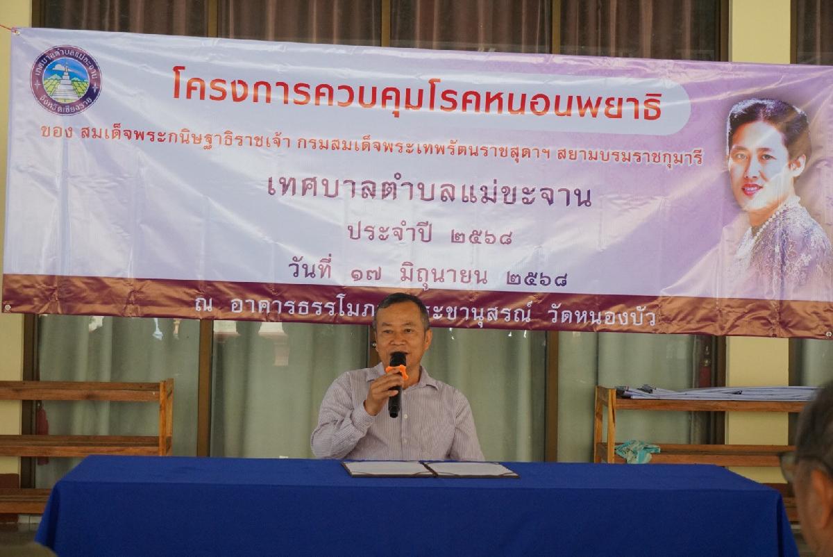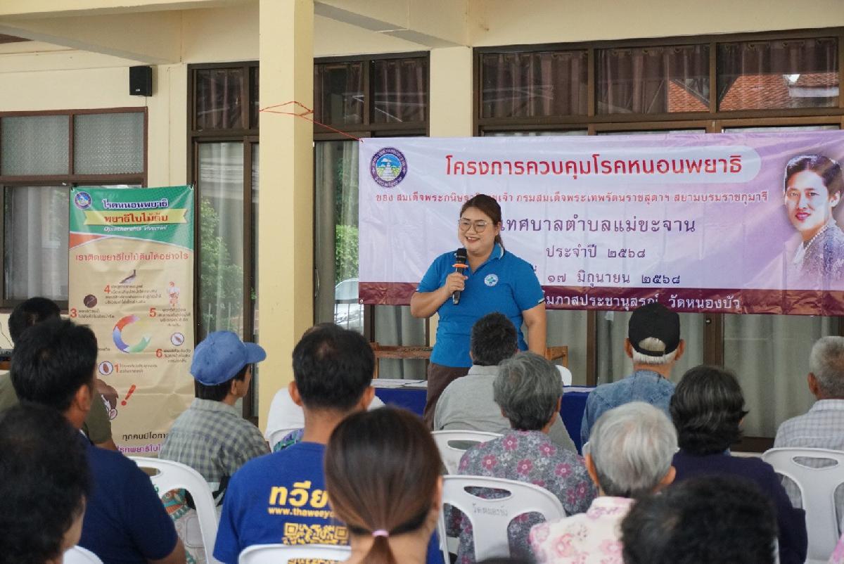 วันที่ 17 มิถุนายน 2568 เทศบาลตำบลแม่ขะจาน โดย นายประเทือง ปองดอง รองปลัดเทศบาลตำบลแม่ขะจาน และ ข้าราชการ ลูกจ้าง กองสาธารณสุขและสิ่งแวดล้อม และประชาชนกลุ่มเป้าหมายเข้าร่วมโครงการควบคุมโรคหนอนพยาธิ ของสมเด็จพระกนิษฐาธิราชเจ้า กรมสมเด็จพระเทพรัตนราชสุดาฯ สยามบรมราชกุมารี เพื่อส่งเสริมความรู้เกี่ยวกับการป้องกันกับการใช้ชีวิตประจำวันที่เกี่ยวข้องกับโรคหนอนพยาธิ