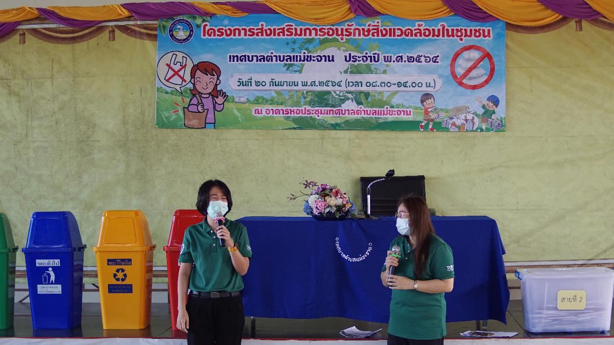 วันที่ 20 กันยายน 2564 เทศบาลตำบลแม่ขะจาน ได้ดำเนินการจัด “ โครงการส่งเสริมการอนุรักษ์สิ่งแวดล้อมในชุมชน ” โดยมีนายเทียนชัย จันทร์เครือ นายกเทศมนตรีตำบลแม่ขะจาน เป็นประธานในพิธีเปิดโครงการ ณ หอประชุมเทศบาลตำบลแม่ขะจาน ซึ่งการดำเนินการตามโครงการฯ ดังกล่าว มีวัตถุประสงค์ เพื่อส่งเสริมให้ประชาชนในพื้นที่ได้มีส่วนร่วมในการอนุรักษ์สิ่งแวดล้อมในการคัดแยกขยะมูลฝอยและขยะประเภทต่างๆ ได้อย่างถูกต้อง ก่อนที่จะนำมาทิ้งจากครัวเรือนและการส่งเสริมให้พื้นที่ในเชตชุมชนเทศบาลตำบลแม่ขะจาน มีสถานที่ทิ้งขยะประเภทขยะรีไซเคิลและขยะอันตราย โดยมีวิทยากรจากสำนักงานทรัพยากรธรรมชาติและสิ่งแวดล้อม จังหวัดเชียงราย มาบรรยายให้ความรู้ในครั้งนี้