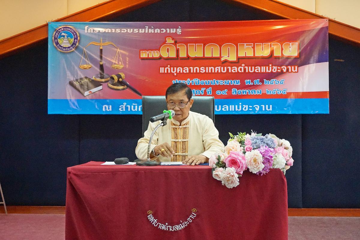 วันที่ 19 สิงหาคม 2565 เทศบาลตำบลแม่ขะจาน ได้จัด “ โครงการอบรมให้ความรู้ทางด้านกฎหมายแก่บุคลากรเทศบาลตำบลแม่ขะจาน ” เพื่อให้คณะผู้บริหาร สมาชิกสภาเทศบาล พนักงานเทศบาล พนักงานจ้างและลูกจ้างประจำของเทศบาลตำบลแม่ขะจาน ได้เพิ่มพูนทักษะความรู้ ความเข้าใจเกี่ยวกับระเบียบกฎหมายที่เกี่ยวข้องในการปฏิบัติงาน สามารถนำไปปรับใช้ในการปฏิบัติงานได้อย่างถูกต้อง การจัดอบรมในครั้งนี้ได้รับการบรรยายให้ความรู้จากสำนักงานยุติธรรมจังหวัดเชียงราย