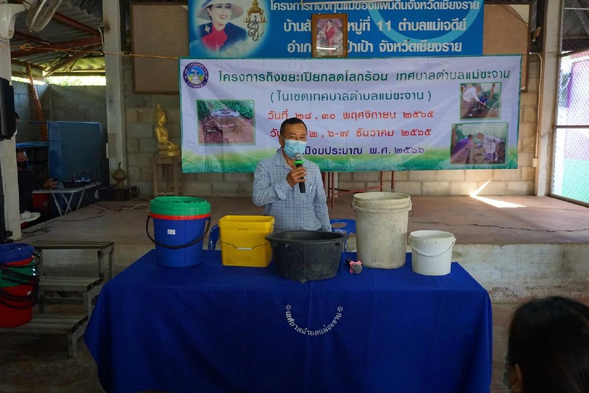 เทศบาลตำบลแม่ขะจาน ได้จัด “ โครงการถังขยะเปียกลดโลกร้อน เทศบาลตำบลแม่ขะจาน ” โดยนายเทียนชัย จันทร์เครือ นายกเทศมนตรีตำบลแม่ขะจาน ได้นำคณะผู้บริหาร สมาชิกสภาเทศบาลและพนักงานเทศบาล ได้ลงพื้นที่อบรมให้ความรู้ แก่ประชาชนในพื้นที่เทศบาล ระหว่างวันที่ 28 พฤศจิกายน 2565 ถึง วันที่ 9 ธันวาคม 2565 ซึ่งภายในกิจกรรม ประกอบด้วย การบรรยายเรื่องการบริหารขยะมูลฝอย ด้วยกระบวนการที่เป็นมิตรต่อสิ่งแวดล้อม รวมถึงการสาธิตและลงมือปฏิบัติ ในการทำถังขยะเปียกลดโลกร้อนที่ถูกต้อง เป็นต้น