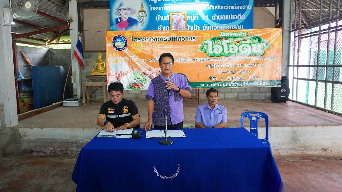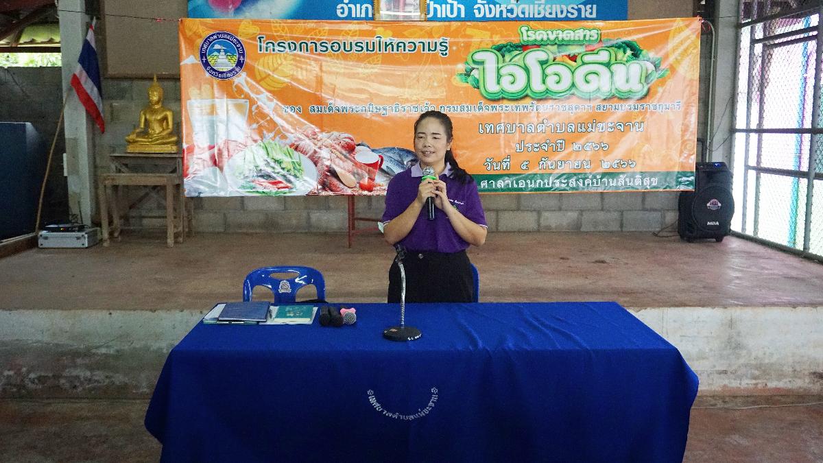 วันที่ 5 กันยายน 2566 เทศบาลตำบลแม่ขะจาน ได้จัด “ โครงการอบรมให้ความรู้โรคขาดสารไอโอดีน เทศบาลตำบลแม่ขะจาน ประจำปี 2566 ” โดยมีนายเทียนชัย จันทร์เครือ นายกเทศมนตรีตำบลแม่ขะจาน เป็นประธานในพิธีเปิดโครงการ ณ ศาลาอเนกประสงค์บ้านสันติสุข โดยดำเนินการตามโครงการพระราชดำริ ด้านสาธารณสุขของสมเด็จพระกนิษฐาธิราชเจ้า กรมสมเด็จพระเทพรัตนราชสุดาฯ สยามบรมราชุมารี โดยมีวัตถุประสงค์เพื่อให้ผู้เข้าร่วมอบรมมีความรู้ ความเข้าใจที่ถูกต้อง เกี่ยวกับโรคขาดสารไอโอดีนและส่งเสริมให้มีการใช้เกลือไอโอดีนที่ได้มาตรฐาน โดยมีวิทยากรจากโรงพยาบาลส่งเสริมสุขภาพตำบลแม่เจดีย์ นางสาวทิพวรรณ พรหมเรืองฤทธิ์ พยาบาลวิชาชีพ เป็นผู้บรรยายให้ความรู้ในครั้งนี้