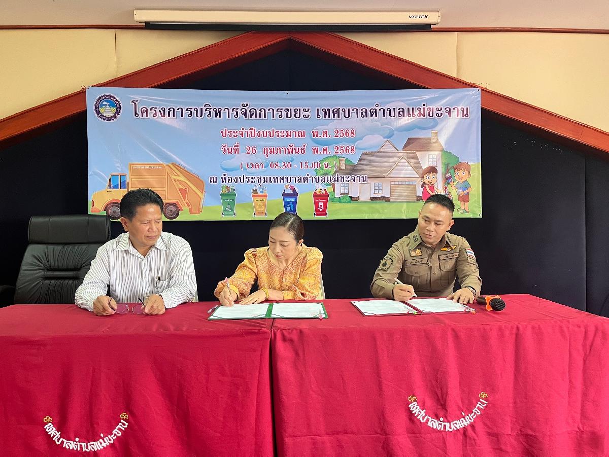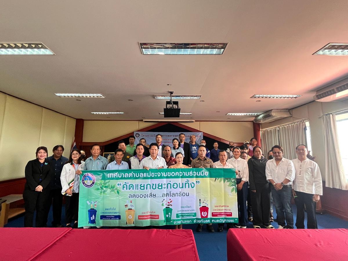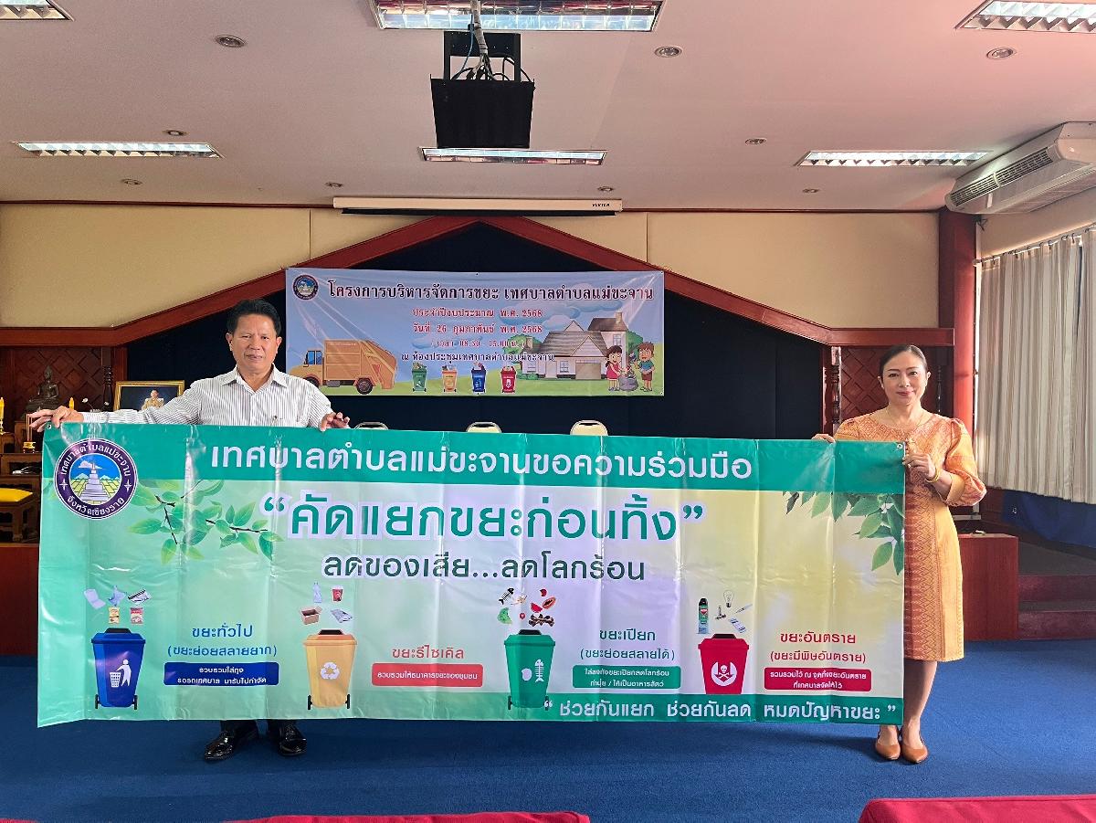 วันที่ 26 กุมภาพันธ์ 2568 เทศบาลตำบลแม่ขะจาน ได้จัด " โครงการบริหารจัดการขยะ เทศบาลตำบลแม่ขะจาน " โดยมีนายเทียนชัย จันทร์เครือ นายกเทศมนตรีตำบลแม่ขะจาน เป็นประธานในพิธีเปิดโครงการฯ ณ ห้องประชุมเทศบาลตำบลแม่ขะจาน ซึ่งการดำเนินการตามโครงการฯ ดังกล่าว มีวัตถุประสงค์ เพื่อรณรงค์สร้างความรับรู้ ความเข้าใจและปลูกจิตสำนักให้ประชาชนในท้องถิ่นมีส่วนร่วมในการลดปริมาณและคัดแยกขยะมูลฝอยตามหลักการ 3Rs และได้มีการใช้วัสดุธรรมชาติหรือวัสดุที่เป็นมิตรกับสิ่งแวดล้อมทดแทนการใช้ถุงพลาสติก/โฟม อีกทั้งเป็นการช่วยลดการก๊าซเรือนกระจกได้ทั้งทางตรงและทางอ้อม