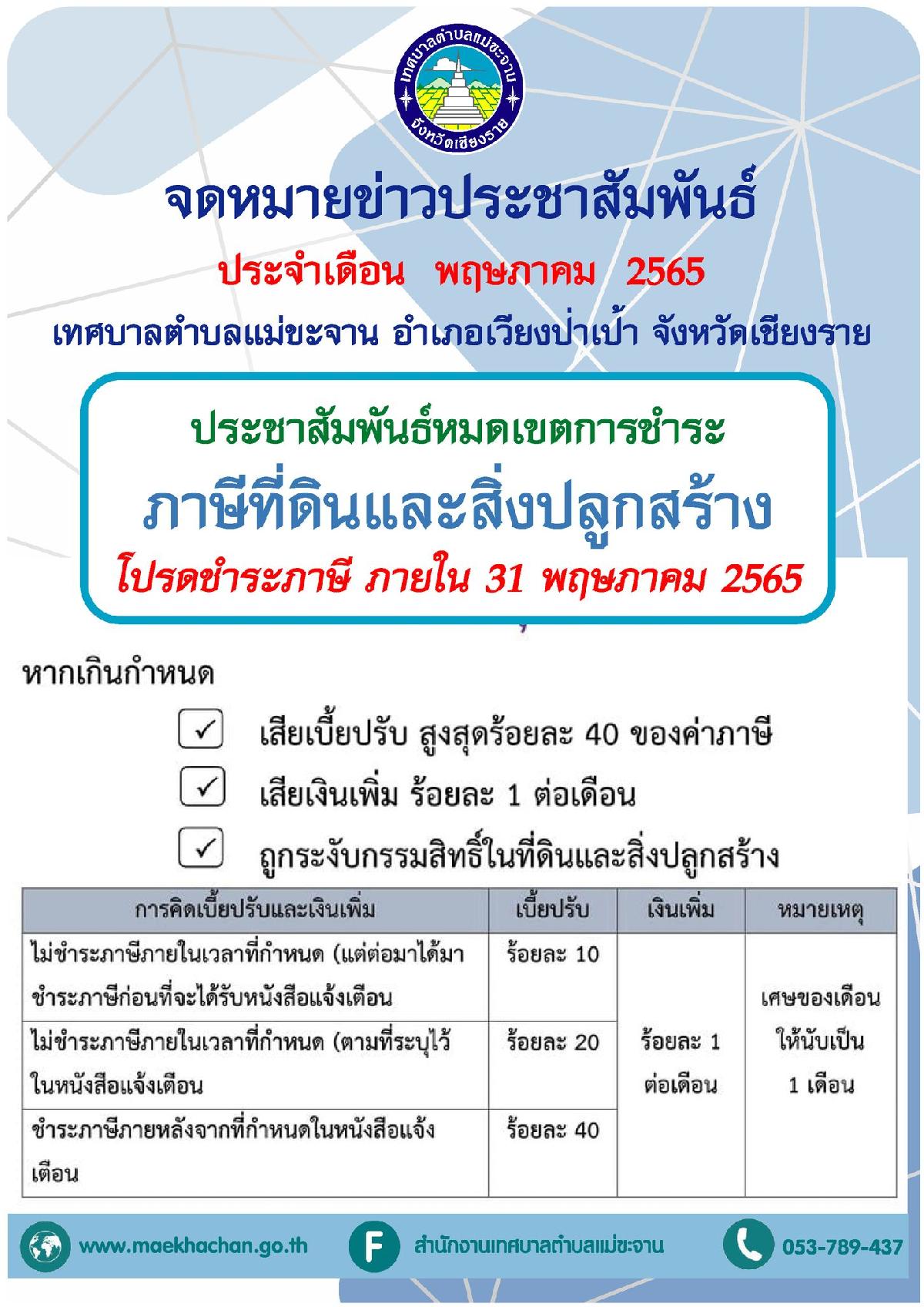 ประชาสัมพันธ์เรื่องการชำระภาษีที่ดินและสิ่งปลูกสร้าง (โปรดชำระภาษี ภายใน 31 พฤษภาคม 2565)
