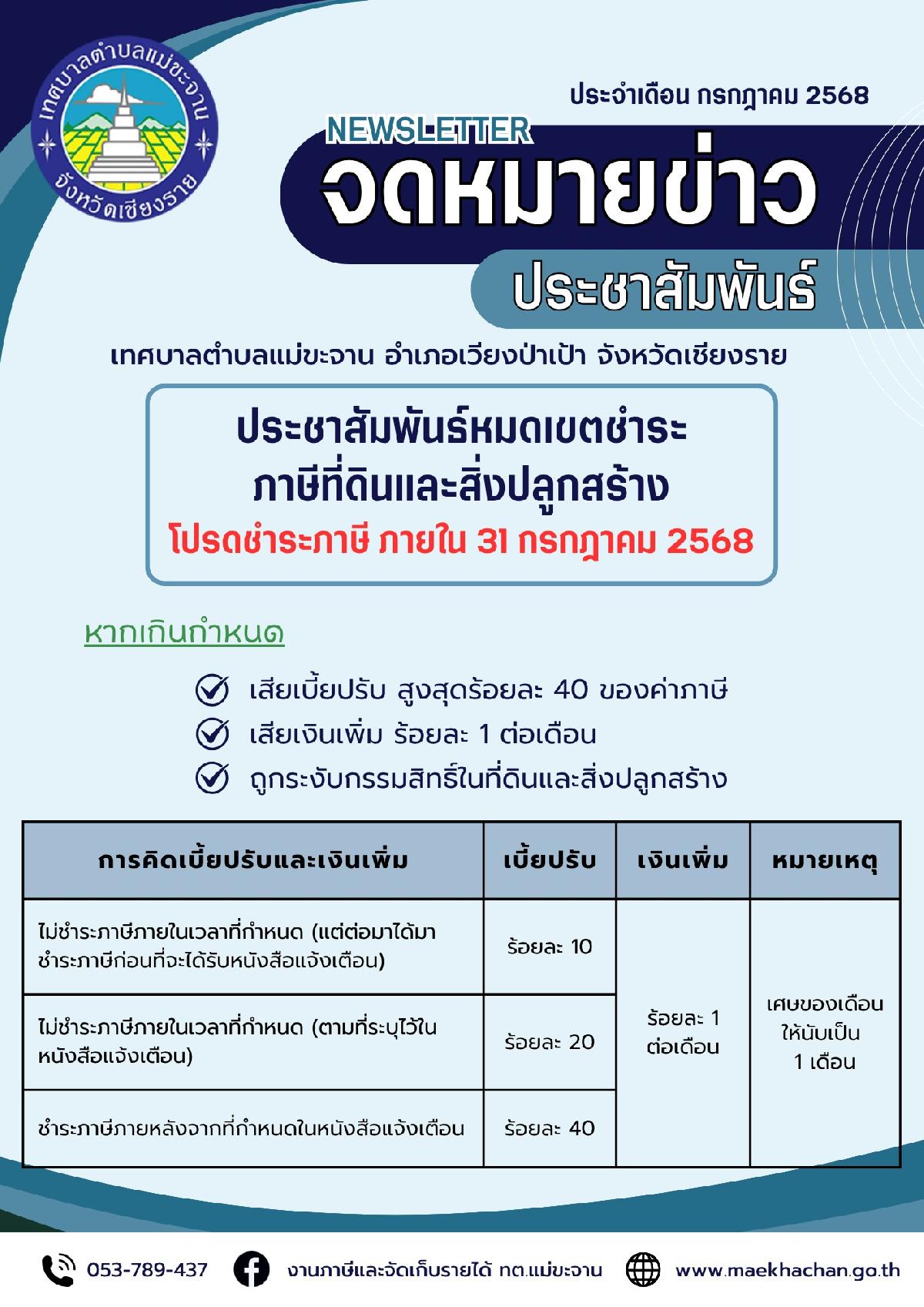 ประชาสัมพันธ์การหมดเขตชำระภาษีที่ดินและสิ่งปลูกสร้าง ประจำปี พ.ศ. 2568