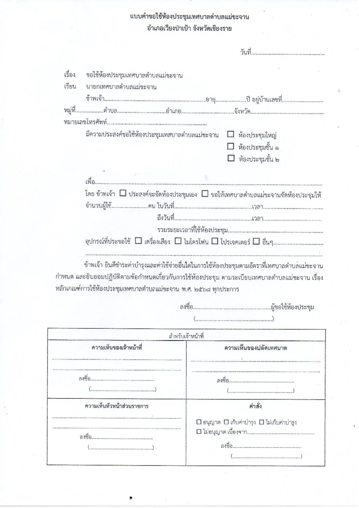 แบบคำขอใช้ห้องประชุมเทศบาลตำบลแม่ขะจาน